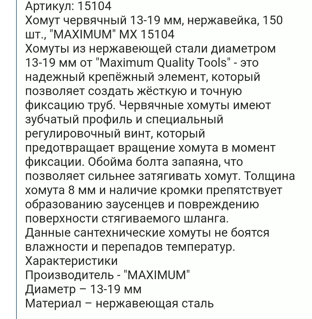 Хомуты из нержавеющей стали диаметром 13-19 мм от "Maximum Quality Tools" - это надежный крепёжный элемент, который позволяет создать жёсткую и точную фиксацию труб. Червячные хомуты имеют зубчатый профиль и специальный регулировочный винт, который предотвращает вращение хомута в момент фиксации. Обойма болта запаяна, что позволяет сильнее затягивать хомут. Толщина хомута 8 мм и наличие кромки препятствует образованию заусенцев и повреждению поверхности стягиваемого шланга.
